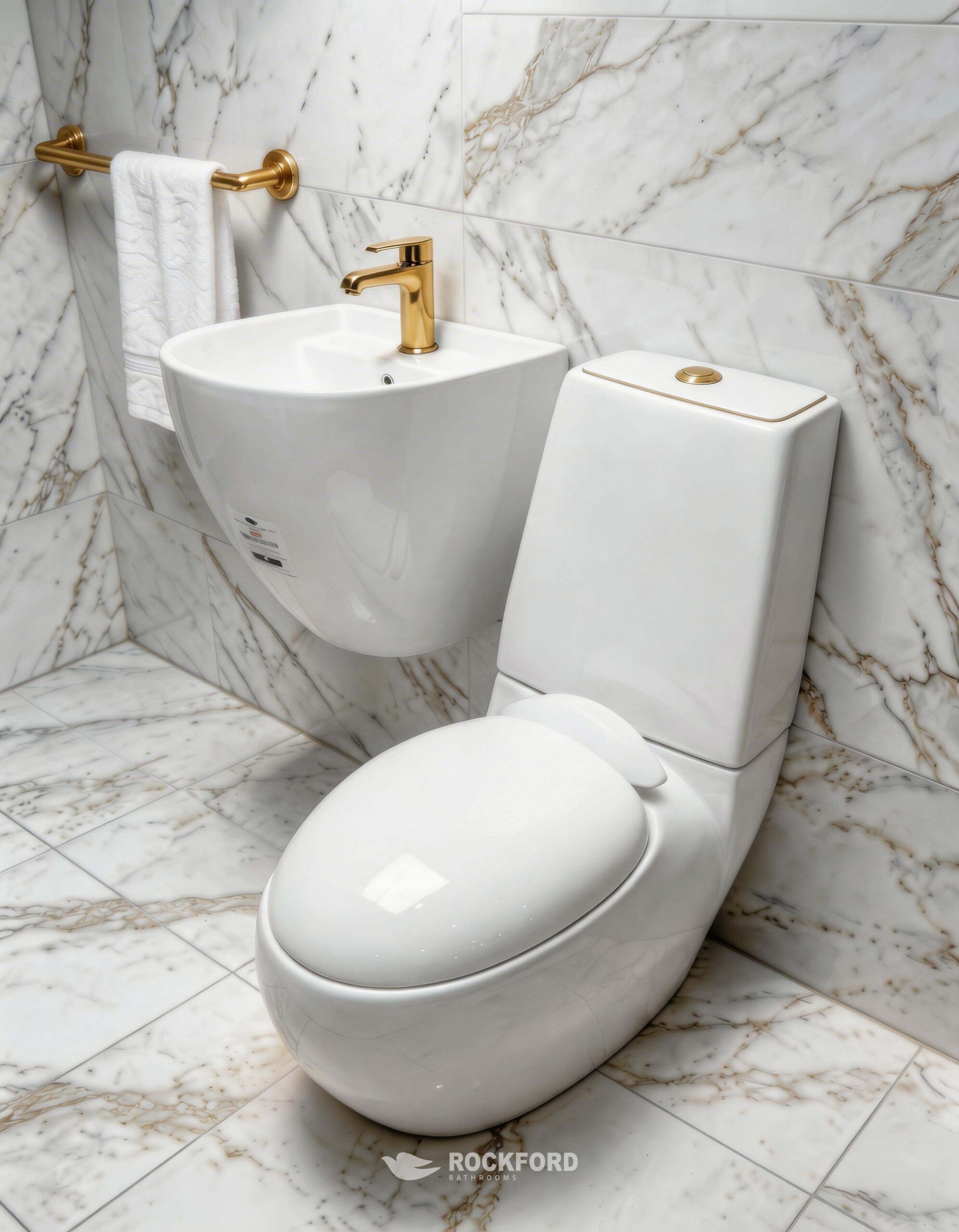 Make a commanding statement with the Rockford Castle White Suite, where timeless purity meets modern luxury. This premium two-piece set features a contemporary, close-coupled toilet paired with a sleek, space-saving wall-hung basin. Both pieces are finished in a brilliant, high-gloss white ceramic, perfectly accented by a refined gold-toned flush button for an understated touch of opulence. Ideal for those seeking to brighten their space with a clean, airy, and prestigious aesthetic, this suite combines advanced, water-efficient flushing performance with the uncompromising, artisanal quality Rockford is renowned for.