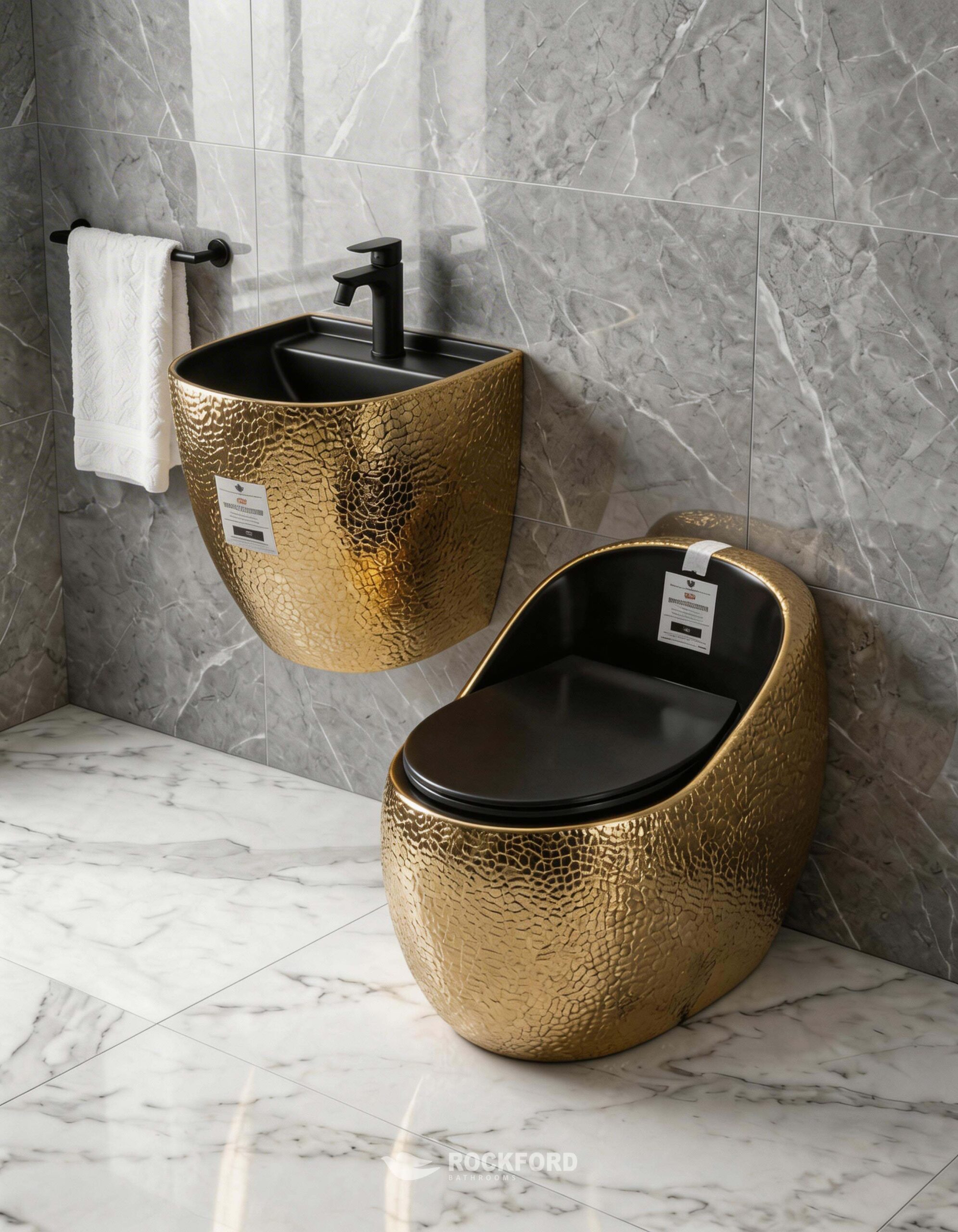 Make an unforgettable statement with the Rockford Olive Black Suite, a masterpiece of high-shine, avant-garde design. This premium two-piece set features a sleek, organic-shaped toilet paired with a modern, wall-hung basin. Both pieces are finished in a brilliant, mirror-polished metallic gold and black, creating a breathtaking focal point that exudes pure opulence. Ideal for those looking to transform their bathroom into a high-fashion, luxury sanctuary, this suite combines advanced, water-efficient flushing performance with the uncompromising, artisanal quality Rockford is known for.