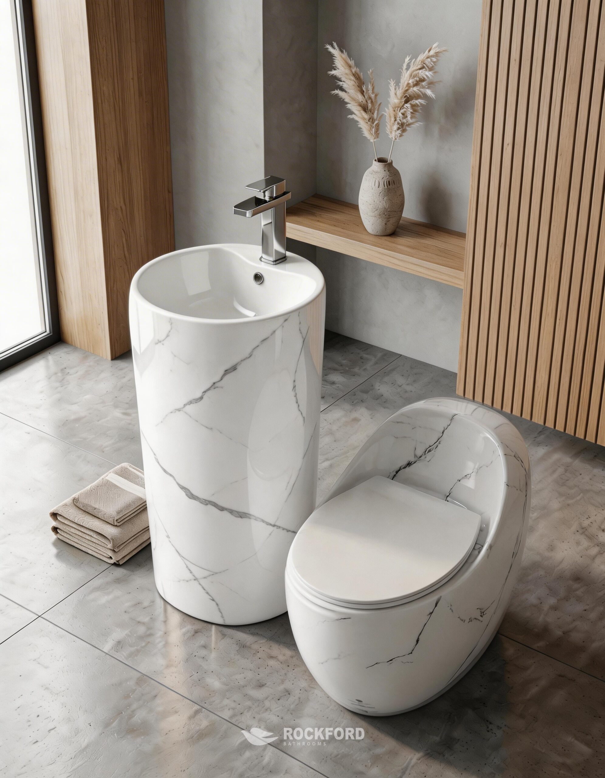 Elevate your bathroom with the Rockford Olive Marble White Suite, where timeless classic luxury meets avant-garde, sculptural design. This premium two-piece set features a sleek, organic-shaped one-piece toilet paired with a stunning, cylindrical freestanding pedestal basin. Both pieces are finished in a sophisticated white marble pattern with elegant grey veining, creating a light, airy, and high-end aesthetic. Ideal for those seeking to redefine their space with bright, clean, and luxurious tones, this suite combines advanced, water-efficient flushing performance with the uncompromising, artisanal quality Rockford is renowned for.