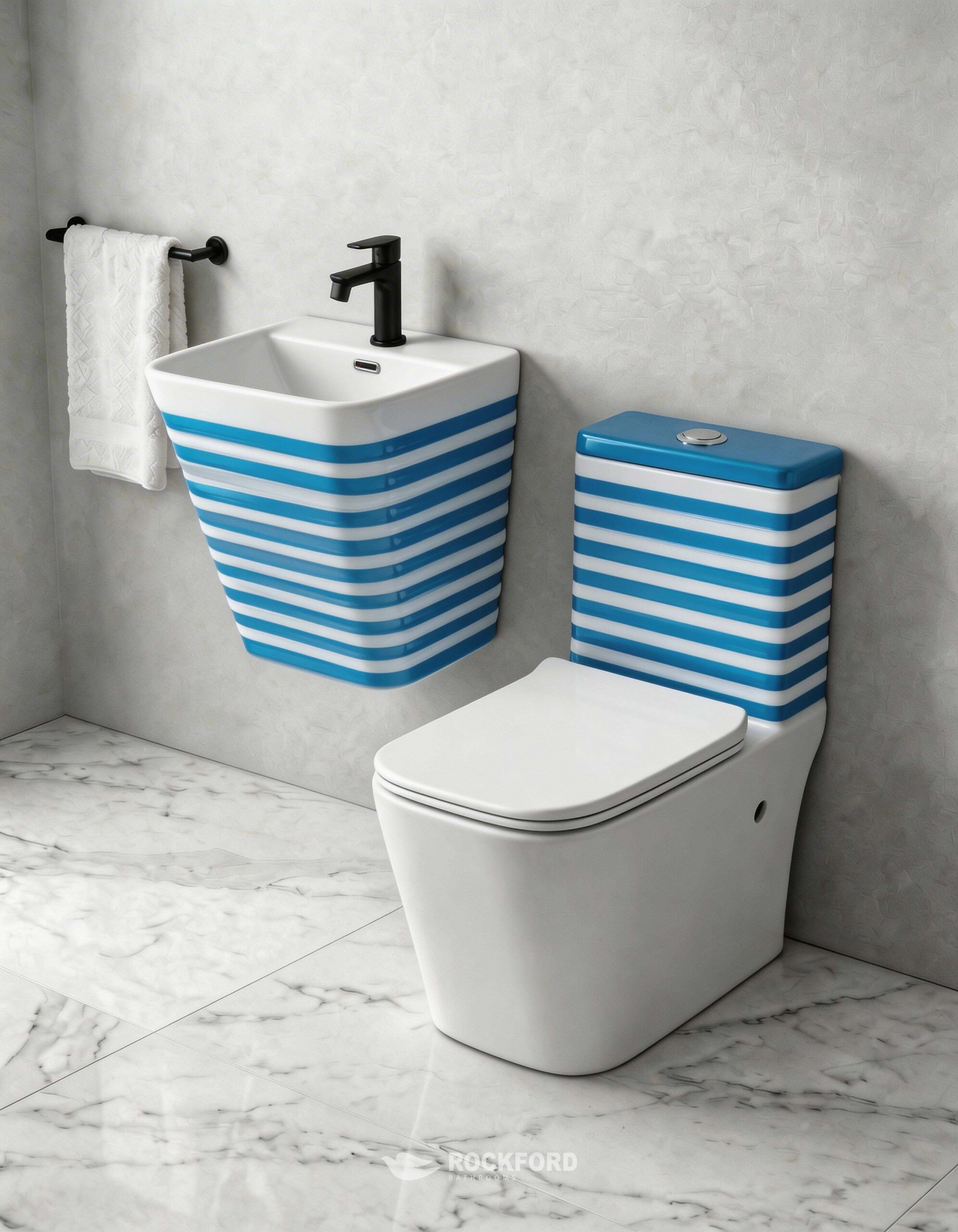Make an unforgettable statement with the Rockford Wembly Blue and White Suite, a masterpiece. This premium two-piece set features a sleek toilet paired with a modern, wall-hung basin. Both pieces are finished in a brilliant, mirror-polished metallic white and blue, creating a breathtaking focal point that exudes pure opulence. If you’re looking to turn your bathroom into a high-fashion, luxury sanctuary, this suite combines advanced, water-efficient flushing performance with Rockford’s signature artisanal quality.
