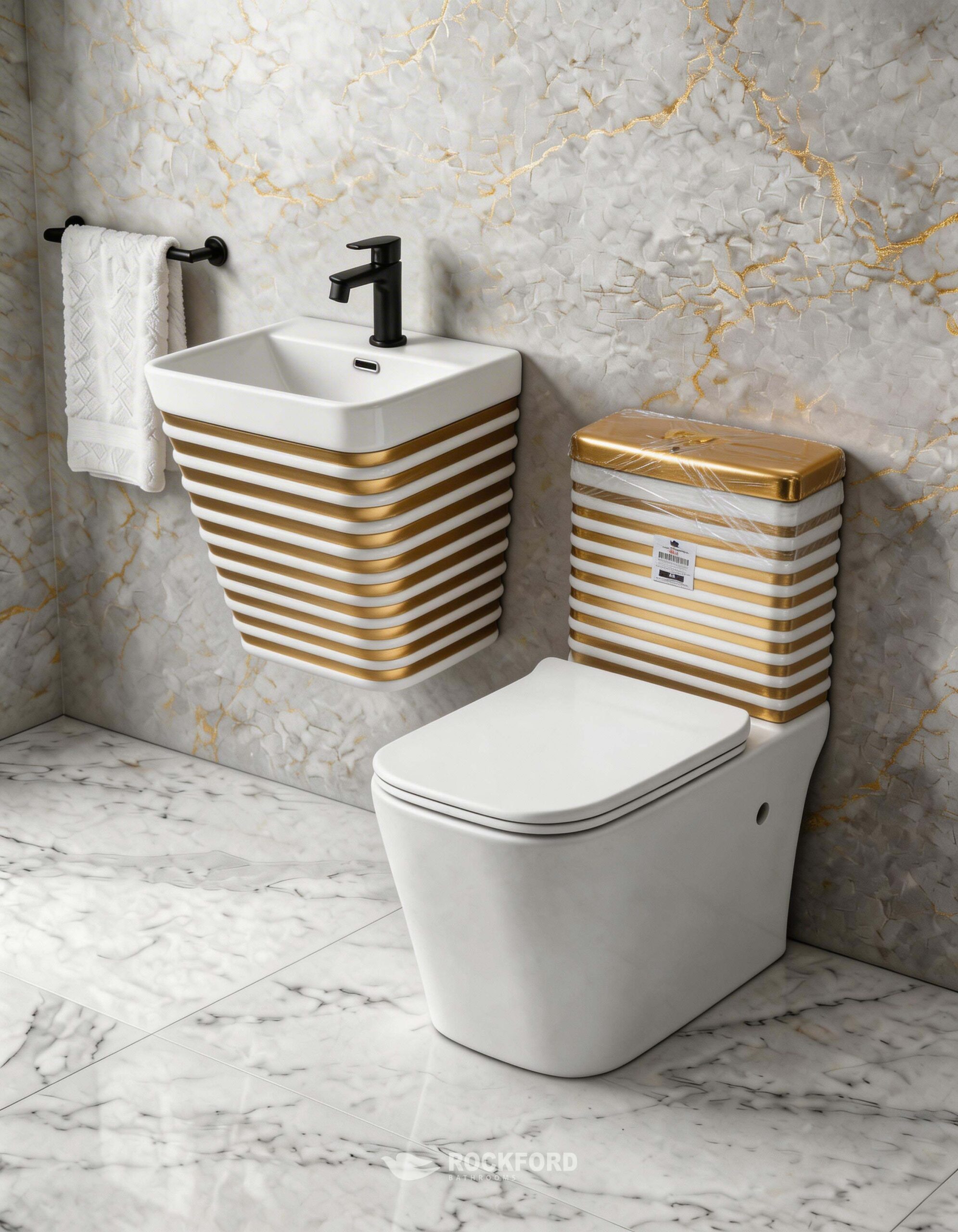 Make an unforgettable statement with the Rockford Wembly Gold and White Suite, a masterpiece. This premium two-piece set features a sleek toilet paired with a modern, wall-hung basin. Both pieces are finished in a brilliant, mirror-polished metallic white and gold, creating a breathtaking focal point that exudes pure opulence. If you’re looking to turn your bathroom into a high-fashion, luxury sanctuary, this suite combines advanced, water-efficient flushing performance with Rockford’s signature artisanal quality.