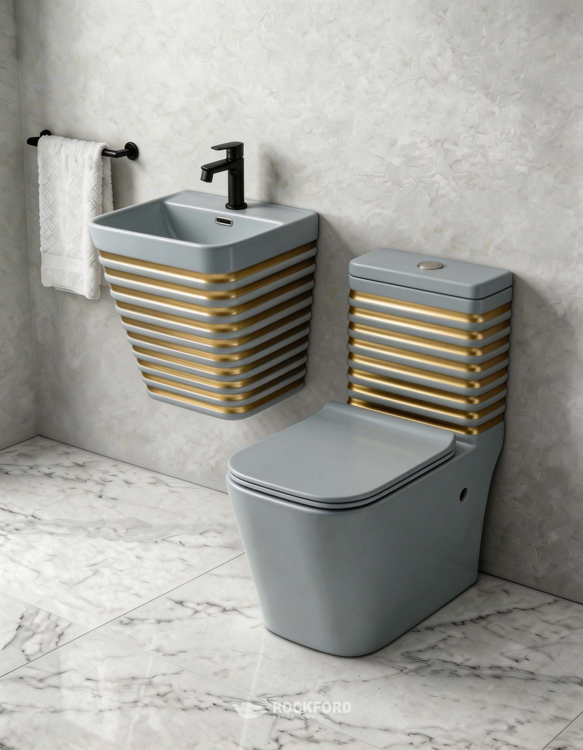 Make an unforgettable statement with the Rockford Wembly Grey and Gold Suite, a masterpiece.  This premium two-piece set features a sleek toilet paired with a modern, wall-hung basin. Both pieces are finished in a brilliant, mirror-polished metallic gold and grey, creating a breathtaking focal point that exudes pure opulence. If you’re looking to turn your bathroom into a high-fashion, luxury sanctuary, this suite combines advanced, water-efficient flushing performance with Rockford’s signature artisanal quality.