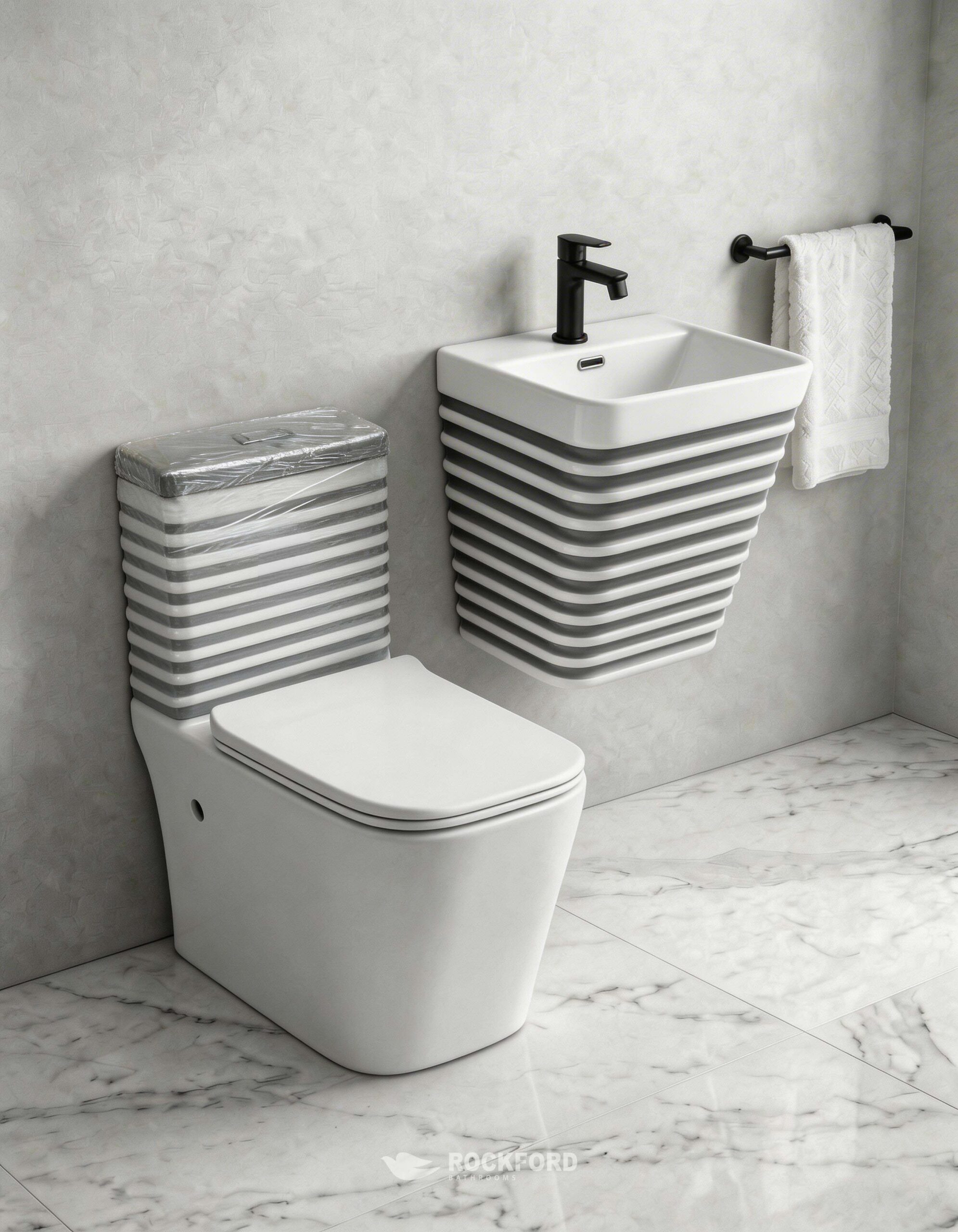 Make an unforgettable statement with the Rockford Wembly Grey and White Suite, a masterpiece.  This premium two-piece set features a sleek toilet paired with a modern, wall-hung basin. Both pieces are finished in a brilliant, mirror-polished metallic white and grey, creating a breathtaking focal point that exudes pure opulence. If you’re looking to turn your bathroom into a high-fashion, luxury sanctuary, this suite combines advanced, water-efficient flushing performance with Rockford’s signature artisanal quality.
