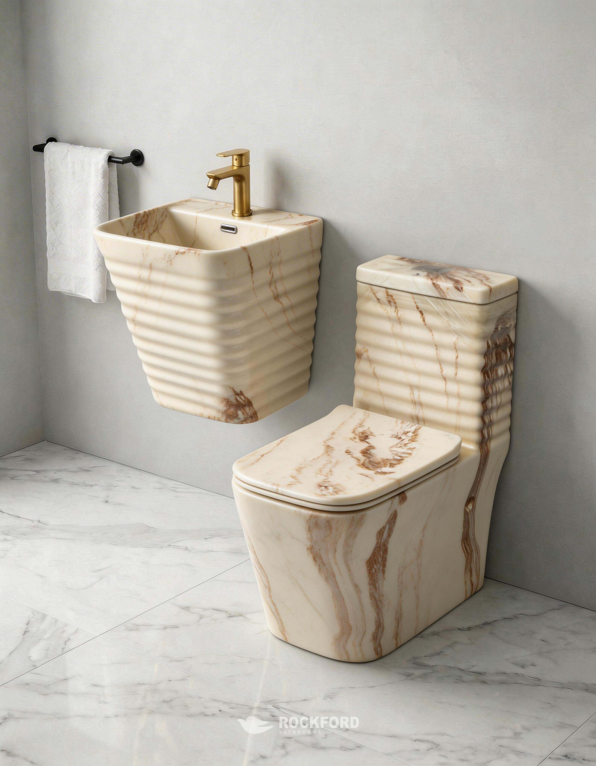 Make an unforgettable statement with the Rockford Wembly Marble 10 Suite, a masterpiece. This premium two-piece set features a sleek toilet paired with a modern, wall-hung basin. Both pieces are finished in a brilliant, mirror-polished marble creating a breathtaking focal point that exudes pure opulence. If you’re looking to turn your bathroom into a high-fashion, luxury sanctuary, this suite combines advanced, water-efficient flushing performance with Rockford’s signature artisanal quality.